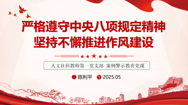 2025年5月27日,人文社科教师第一党支部在yl1111永利集团会议室开展“严格遵守中央八项规定精神,坚持不懈推进作风建设”警示教育专题党课。党支部书记陈利平同志担任主讲,支部全体党员参会。党课以理论阐释、案例剖析与实践指引相结合的方式展开,引导党员干部以案为鉴、警钟长鸣,持续巩固风清气正的政治生态。
